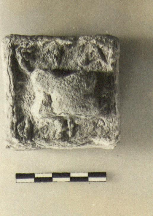 | Description: | A large square inscribed weight. In relief on upper surface, astragal (?). | |