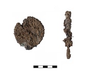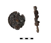 | Description: | Iron disk (mended from five fragments) and shaft (mended from two fragments). Chip missing from the disk. Both very corroded. Bulbous corrosion products on underside of disk, bronze adhering to one area. Bones incorporated into the corrosion of the shaft. Round, flat iron disk with raised edge. Iron shaft, square in section, originally attached and projecting from center of disk. Found sitting on top of the mouth of chytra P 35446, possibly serving as its lid, with the shaft poking through a hole at the bottom of it. One vial and one small bag of related fragments. | |