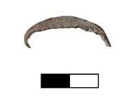 | Description: | Curved strip of lead, broken at both ends? One spot of white corrosion at one end. Thicker at center where it is square in cross section. Both ends flattened and curved inward. Unidentified. | |