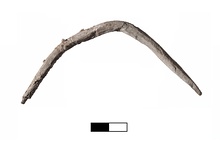 | Description: | One end missing. Surface corroded and flaking mostly at broken end. Shaft bent into semi-circular shape (intentionally?). Thick shaft, square in section, tapers to a blunt point at preserved end. Lead. | |