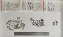 | Description: | Three little bags of fragments. A hand written note reads: "Uninscribed fragments of lead cavalry tablets. From 3rd cent. B.C. fill re-digging." | |