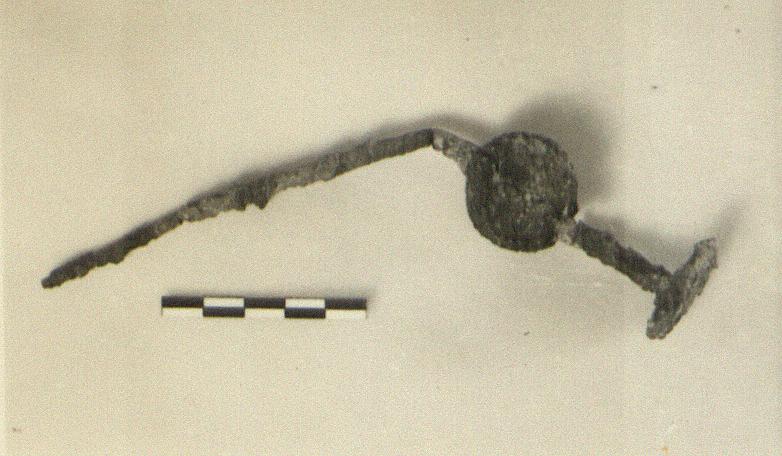 Three fragments preserved, the head with the start of the shaft and the mid part of the shaft with the ball, the latter bent; and a small piece from the lower part of the shaft.