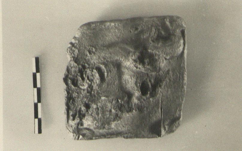 | Description: | Nearly square, rather thin, with a dolphin in relief, diagonally across its upper face. Traces of letters above and below. | |