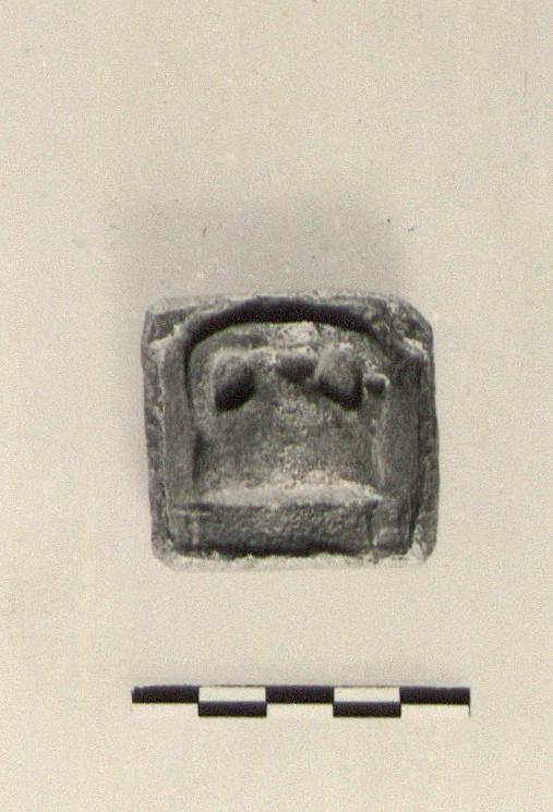 | Description: | Flat, nearly square. In relief on the upper side, the top part of an amphora. Letters below : T and H. | |