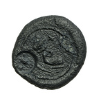 Description:   Obverse: several objects including a dolphin at bottom, ear of wheat at left, at upper right a kantharos with bird (?) standing right in cup; star at top. Countermark of stork and lizard. All within border of dots.