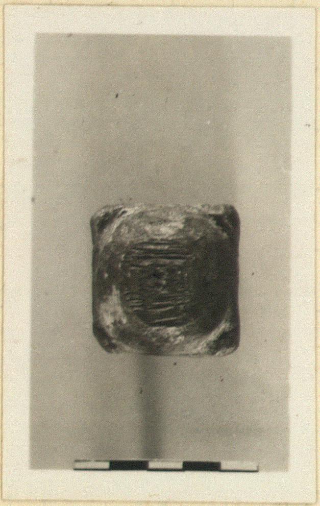 | Description: | Square, with a square cutting beneath. Rounded at top with traces of an iron handle or hook. | |