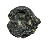 Obverse: Herakles sitting on the rock, left, at right. At left, a tripod. Countermark of stork and lizard.
