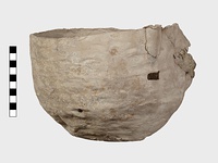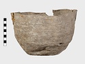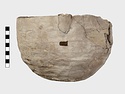 | Description: | Part of one side missing. The whole rather bent out of shape. Rather deep bucket with rounded bottom, and plain rim. Two attachments for a basket handle of iron. | |