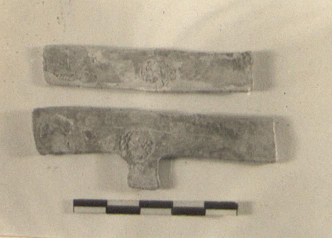| Description: | Twenty-one long, narrow, flat, rectangular strips, twelve with a tab at the side, (one bent over), nine slightly shorter, without tabs. All stamped at the middle with a small circular stamp: a kernos, from which protrude two ears of wheat, within a wreath: coin type of Eleusis. | |