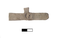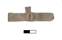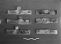 | Description: | Twenty-one long, narrow, flat, rectangular strips, twelve with a tab at the side, (one bent over), nine slightly shorter, without tabs. All stamped at the middle with a small circular stamp: a kernos, from which protrude two ears of wheat, within a wreath: coin type of Eleusis. | |