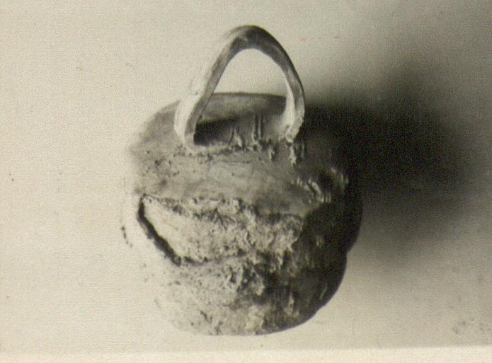 The sides are double, the inner wall extending lower than the outer. Round about the spots where the metal is corroded, a considerable amount of cement adheres; Bedded in the cement are bits of cloth, white, closely woven, with rather coarse thread.