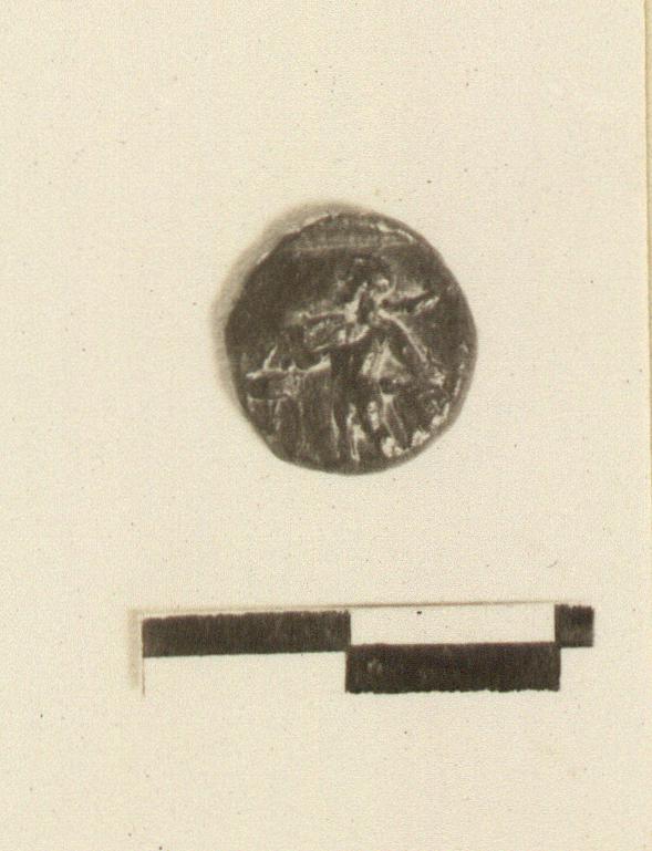Description:   Obverse: Herakles with a club over his shoulder, dragging with his left hand a beast, moves left to a tripod.
