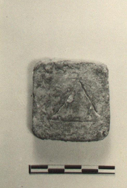 | Description: | Thin square slab of lead. Carelessly incised on the side, the letter delta (Δ). <graphic> | |