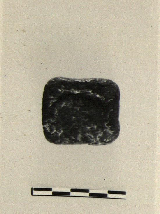 Description:   A square one, fairly thick, with a depression in its upper face.