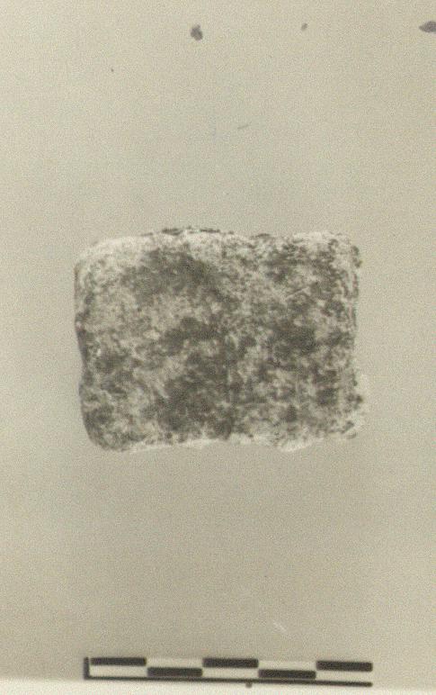 | Description: | Rectangular. Battered. Top preserves remains of rim and possibly part of a design or letters. | |