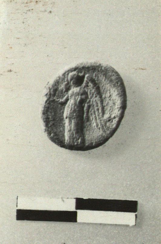 | Description: | Obverse: winged Nike, wearing chiton, standing left, holding a small vertical object (xoanon ?) on her outstretched right hand. Reverse: plain. | |