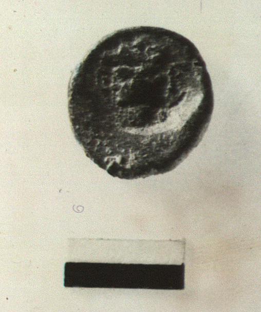 | Description: | Struck off center, on one side only. Obverse: two round-faced unbearded heads back to back with bearded head set across the top facing up. Reverse: plain. | |