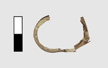 | Description: | Narrow strip of gold leaf, with edges turned down. One half is curved in a semicircle, the other is bent and crumpled. Gold banding for some wooden object, presumably round. Perhaps decoration of hilt. | |