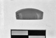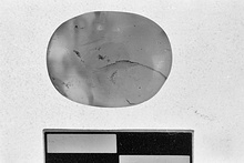 | Description: | Oval setting from bezel. Flat on bottom, convex on top, carefully polished but undecorated. Almost colorless, slightly veined. | |
