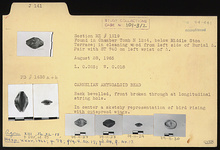 | Description: | Amygdaloid bead. Back bevelled, front broken through at longitudinal string hole. In center a sketchy representation of bird rising with outspread wings. | |