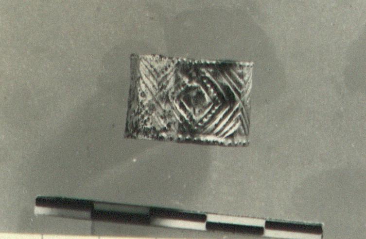 | Description: | Intact broad finger ring. Bent flat, when found, but easily opened. Simple circle; sides not profiled. Repousse. Top and bottom, row of dots. Around side, chain of four receding lozenges (straight line, dots, straight line) the angles above and below them filled with receding triangles, the innermost of dots. Early Geometric. 1.85gr | |
