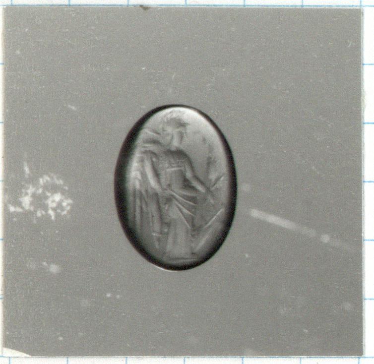 | Description: | Intact carved (carnelian?) ring bezel. Oval, slightly curved back flaring to curved face. Helmeted, draped female figure facing right. Possibly winged, or holding drapery in her right hand (holds a cornucopia), bent up at the elbow, left hand held down with a sheat of wheat (?). Other indistinct attributes in background (below the wheat a poppy or a sistrum? At her feet a ship's rudder.) C. Lawton identifies her as Fortuna Panthea. Dark orange, translucent stone. | |