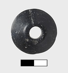 | Description: | Well preserved but for minor chipping. Biconical stone bead, rounded edges. Pierced through center; possible spindle whorl because of wear inside of hole (vertical scratches on the interior of the hole). On exterior, some vertical incision. Black steatite. Cf. MC 1186 | |