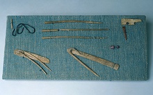 | Description: | Complete. A long piece of fine wire, now bent over double, and worn thin in places. The wire tapers towards the ends, which are turned up in long loops or hooks; at the middle of the piece is a small rectangular piercing. It 's from a balance (?) | |