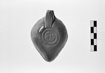 | Description: | On rim, herringbone. On discus, twisted rosette with groove around central filling hole. Handle solid, triple grooved. Nozzle rounded. On bottom, double concentric grooves, signed: "T". Reddish-brown glaze. Red clay. Type XXVIII of Corinth collection. | |