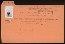 | Description: | About half the reverse and wall, with a single groove. Inscribed within. Red clay and wash. Type XXVIII of Corinth collection. <graphic> | |