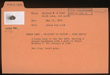 | Description: | A large head to the left, wearing a draped headdress with a knob in front. Mithras (?). Red clay, burnt gray. Type XXVIII of Corinth collection. Cf. Corinth IV, ii, no. 1185. | |