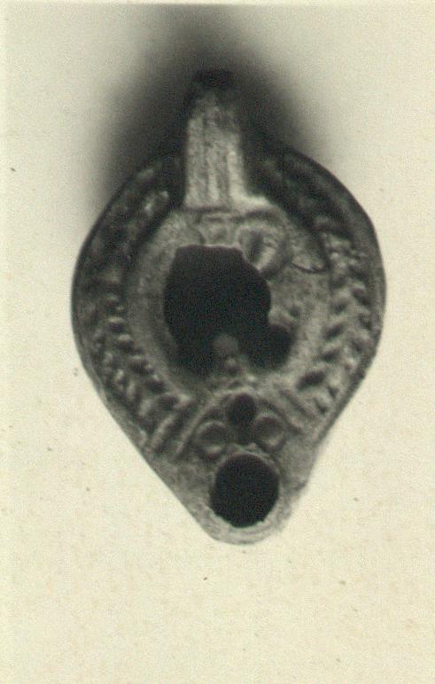 Herringbone on rim; on the discus Christian monogram, with the tail of the "rho" to the right. Solid handle, double grooved above and probably below. Reverse with double almond-shaped grooves surrounding a cross with small circles in the quadrants; two more circles at the base of the handle.