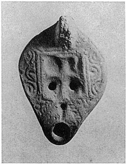 | Description: | Wavy lines on the rim, with groups of three dots on either side of the handle and nozzle. Christian monogram on square discus; the tail of the "rho" to the right; filling holes in the lower quadrants. Handle solid, double grooved above and below; the surface worn, and a large chip missing from the back. Double almond-shaped grooves on the reverse, enclosing a palm branch. Quite possibly slipped. Pinkish-buff clay, grayed on the lower part. Type XXVIII of Corinth collection. | |