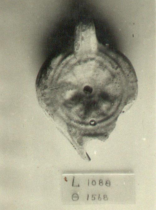 | Description: | Right half of nozzle, and part of side near nozzle broken away. Convex sides; rised dots on rim; obscure rosette on discus outlined by two raised ridges; solid handle with triple groove above and double below; three rings on bottom. Buff slip; poor impression. Buff clay. Type XXVIII of Corinth collection. | |