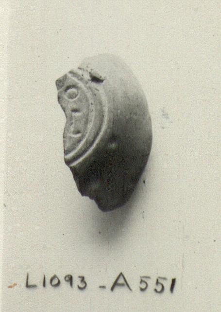| Description: | Fragment from side and bottom. Convex side; within double groove on bottom, the signature. Unglazed. Buff clay with gray core. Type XXVIII of Corinth collection. <graphic> | |