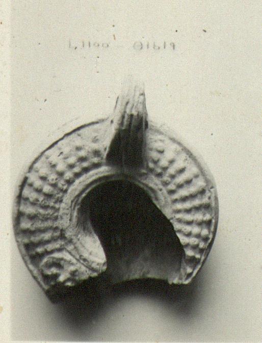 | Description: | Nozzle, much of forepart nd most of discus missing. Convex sides; raised dots on rim; volute at left side of nozzle; pierced handle with triple groove above, double below; raised pellets on side; on reverse, within double groove, rosette of pellets. Traces of brown slip. Greenish, Corinthian clay. Type XXVII variant of Corinth collection. 0 | |