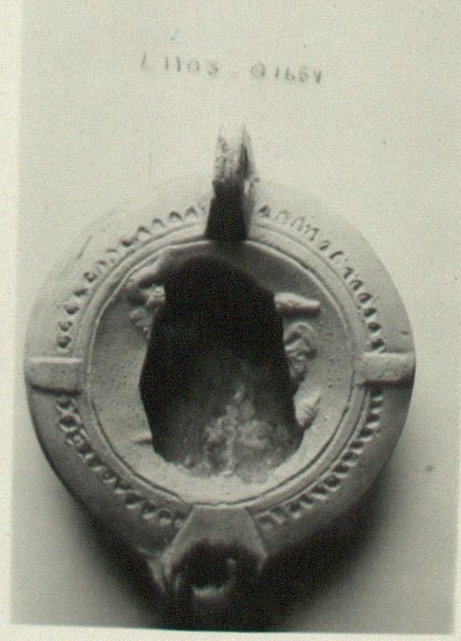 | Description: | The greater part of the discus broken away. Convex sides; ovules on panelled rim; pierced handle with double groove above and below; on reverse, in plain grooved circle the signature. On the discus are: a goose's head at the right, with drapery below; a bit of a wing and torch behind. Unglazed. Pinkish-buff clay. Type XXVII of Corinth collection. ADDENDA For the scene cf. Corinth IV, ii, no. 608, late 2nd.-3rd. century A.D. <graphic> | |
