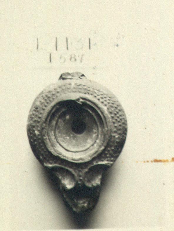 Context:   The five lamps, L 1129-L 1133, all of type XX, were found together, with a quantity of pottery, near the opening into the drain, with coin no. 5. Also from here: L 1150, 1151, P 2446, 2447.
