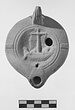 | Description: | Preserved unbroken, save for chips. Plain panelled rim; on the discus a sailing ship, right; straight sided nozzle slightly raised above the rim; pierced handle, triple grooved above, double below. On the reverse, within two concentric grooves, an ivy lraf. Unglazed. Buff clay. Type XXVII of Corinth collection. | |
