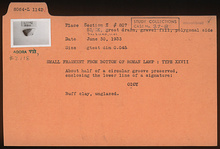 | Description: | Small fragment from bottom of lamp. About half of a circular groove preserved, enclosing the lower line of a signature: "OIOY". Unglazed. Buff clay. Type XXVII of Corinth collection. | |