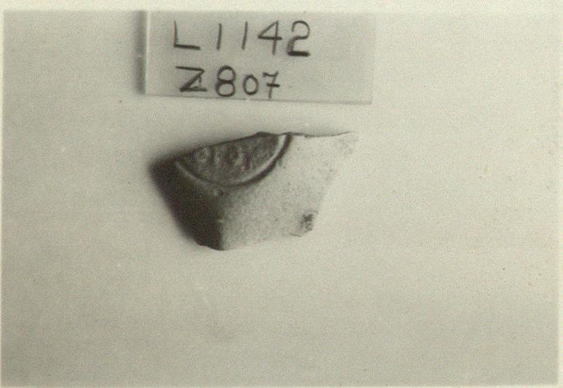 | Description: | Small fragment from bottom of lamp. About half of a circular groove preserved, enclosing the lower line of a signature: "OIOY". Unglazed. Buff clay. Type XXVII of Corinth collection. | |