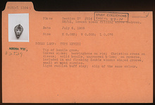 | Description: | Tip of handle gone. Convex sides; herrinbone on rim; Christian cross on discus; solid handle, ungrooved below; on reverse, included in and flanking double almond-shaped groove, small stamped circles. Slip of the same color. Light reddish-buff clay. Type XXVIII of Corinth collection. | |