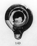 | Description: | Mended from several pieces; fragment missing from wall and bottom; the inner edge of the rim much chipped. No handle. Shallow type; no base; the bottom rises slightly toward the center. Raised band around central opening; large spoon-shaped nozzle encroaching but slightly on the rim. Clazed on the top; the bottom inside; and around the nozzle. A narrow reserved band on the rim where it meets the raised band. Transparent glaze wash on the lower part of the body. Type V (first variety) of Corinth collection, type 20 of Agora collection. ADDENDA Restored in plaster. | |