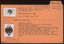 | Description: | Mended from two pieces; all of the bottom, and the nozzle, missing. Fragmentary. The rim slopes upward slightly toward the central opening, which is surrounded by a raised ring. The start of the horizontal handle preserved. Black glaze on the raised ring, and for a band on the top, outside it; and at the handle. The rest of the surface covered with transparent glaze wash. Type V (first variety) of Corinth collection, type 20 of Agora collection. | |
