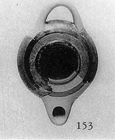 | Description: | Mended from two pieces; all of the bottom, and the nozzle, missing. Fragmentary. The rim slopes upward slightly toward the central opening, which is surrounded by a raised ring. The start of the horizontal handle preserved. Black glaze on the raised ring, and for a band on the top, outside it; and at the handle. The rest of the surface covered with transparent glaze wash. Type V (first variety) of Corinth collection, type 20 of Agora collection. | |
