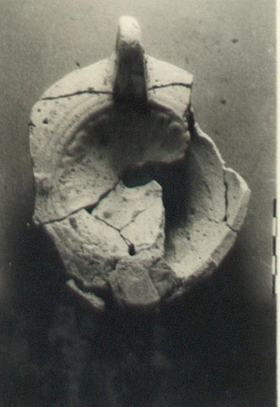 | Description: | Much mended; large pieces of top and sides, and nozzle, missing. Rim plain except for division into panels separated from discus by two grooves. On discus, rosette, much water worn. On reverse, two concentric raised cirles. Unglazed. Fine buff clay. Type XXVII of Corinth collection. | |