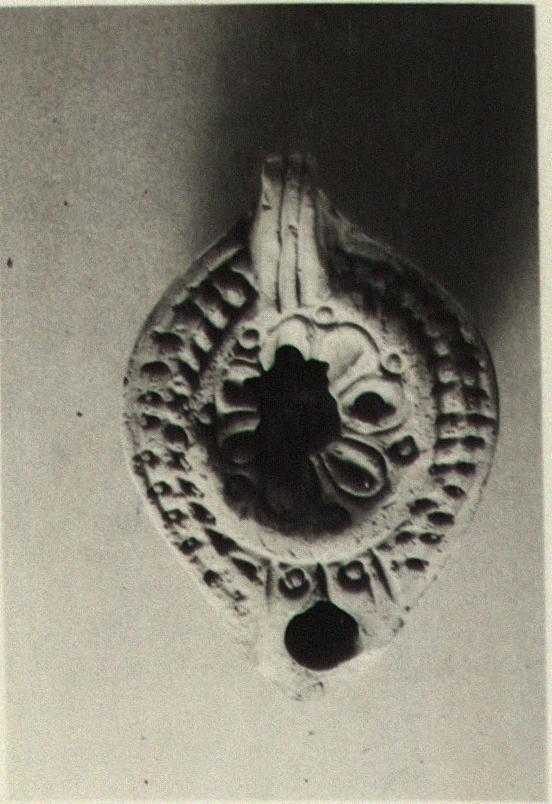 | Description: | The end of the nozzle broken, and the middle of the discus; a hole through the bottom. Rosette on discus; poor herringbone on rim. Solid handle, grooved. On the bottom, almond-shaped grooves, enclosing stamped circles. Type XXVIII of Corinth collection. Cf. L 693. | |