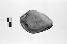 | Description: | Mended from several pieces. On the discus a bird, in a relief. Double row of raised dots on the rim. Solid handle. On the bottom, two almond-shaped grooves with four circles between the grooves, and a line down the middle. Technique recalling type XXVIII of Corinth collection. | |