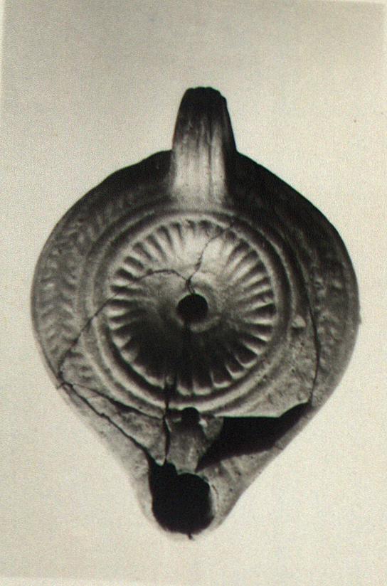 | Description: | Mended from several pieces; bits missing. Solid grooved handle. Rosette on discus, herringbone on rim. On the bottom, within two concentric grooves, the signature "E". Dull purplish wash. Τype XXVIII of Corinth collection. | |