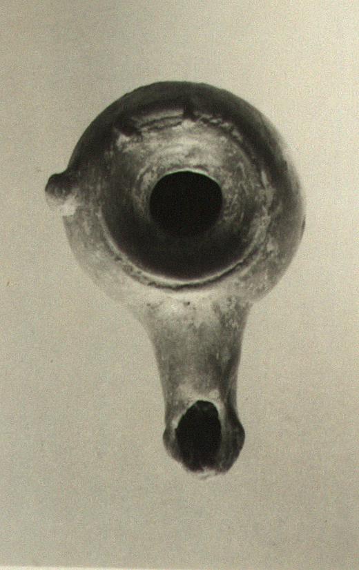 | Description: | Long nozzle; vertical handle broken off. Large knob on left side; rim depressed. Ring foot. Wheel made C. Black glaze. Type XII (late straight variety) of Corinth collection, type 35A of Agora collection. | |